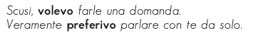 Desiderio o richiesta in tono attenuato nel presente, generalmente con i verbi “volere”, “desiderare”, “preferire”, ecc :