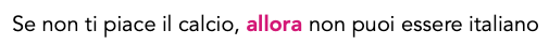 (questa frase è solo per scherzare, puoi essere italiano anche se non ti piace il calcio). In questo caso io sto facendo di nuovo una deduzione! Sto dicendo che visto che in Italia il calcio è molto popolare, se non ti piace il calcio, per quella ragione, allora non puoi essere italiano. Altri esempi: